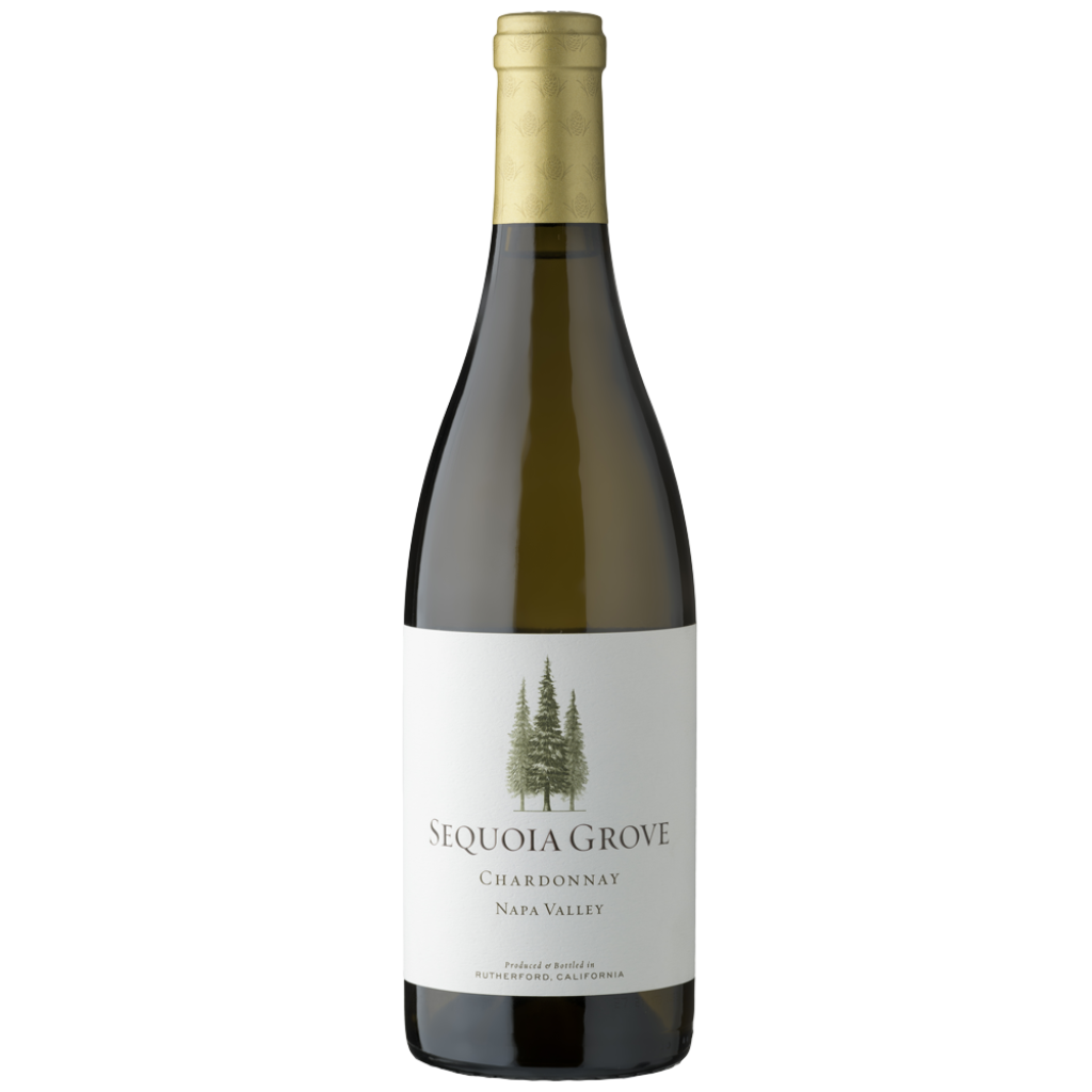 A bottle of Sequoia Grove Chardonnay from Napa Valley, showcasing its minimalist label with iconic sequoia tree imagery.
