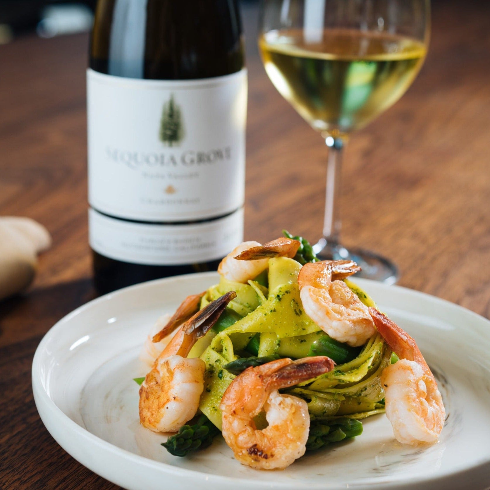 Sequoia Grove Chardonnay paired with a plate of shrimp pasta, elegantly served on a wooden table setting.