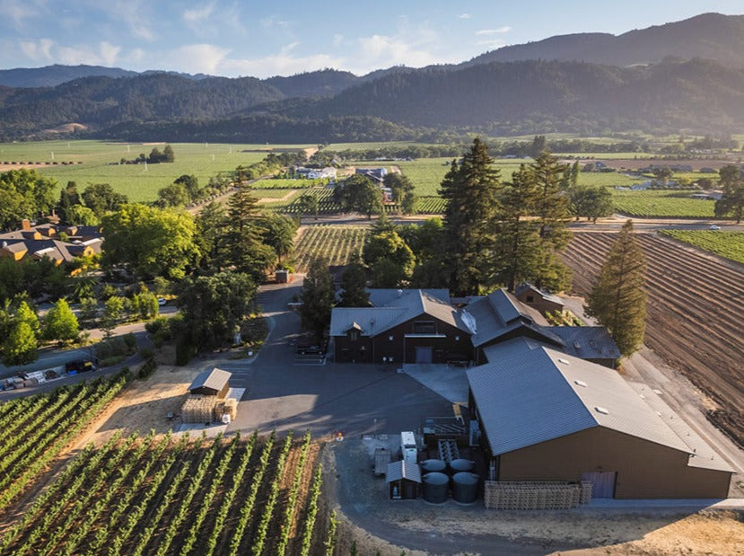 Aerial view of the Sequoia Grove Winery surrounded by vineyards and scenic Napa Valley landscapes.